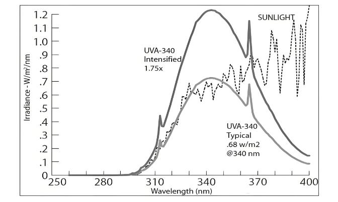 輻照強度:UVA-340為0.89W/m²·nm(340nm波長)。
