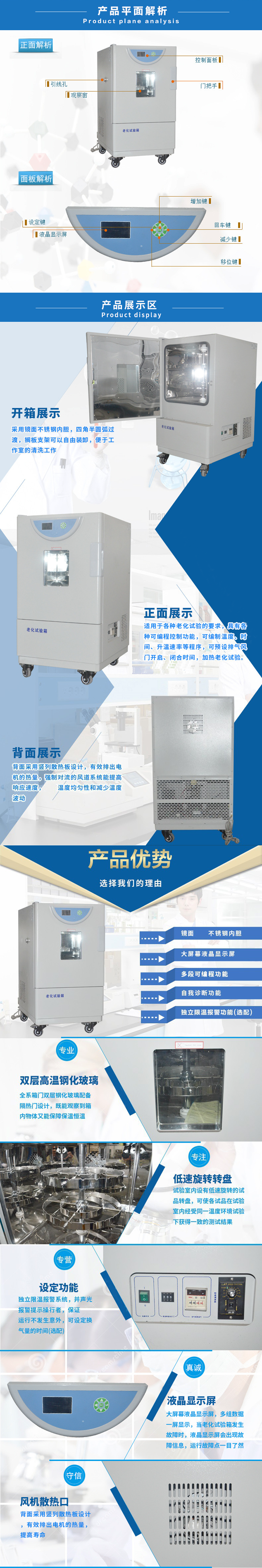 產品用途 新一代老化試驗箱,集公司多年在箱體設計方面的成功經驗,適合于各種老化試驗的要求,具有各種可編程控制功能,可編制溫度、時間、升溫速率等程序,可預設排氣風門開啟、閉合時間,進行加熱老化試驗。